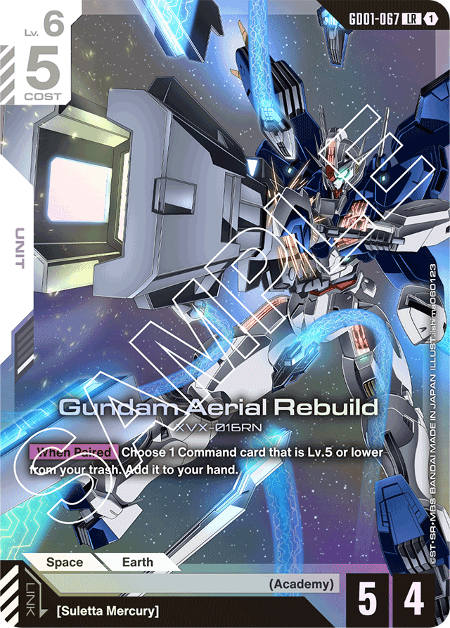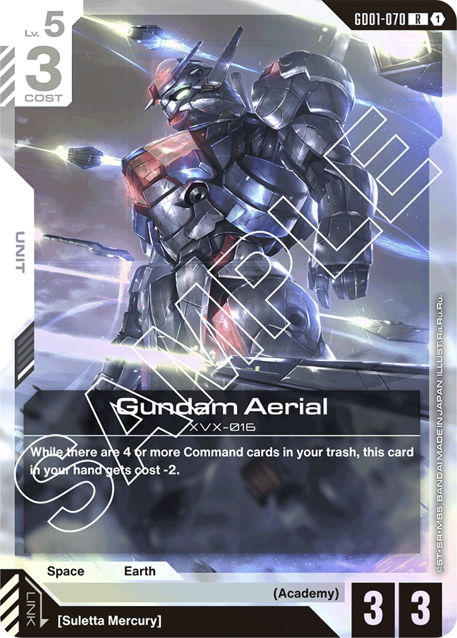 Meanwhile, the much stronger play is the Lv 5 Aerial Gundam. Hit the four Commands in trash threshold and play this Unit for just one resource. Combine that with Suletta Mercury’s effect and essentially you can play a 3/3 Unit for free! Again, this Unit is further made effective thanks to Linking with Sulleta, making it a handy tech in this Command-centric deck.